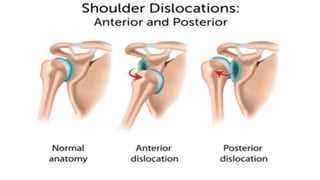 The shoulder is an inherently unstable ball-and-socket joint due to its shallow socket. A dislocated shoulder occurs when the ball of the humerus is forced out of the socket, most commonly anteriorly due to falls or blows. Symptoms include pain, swelling, limited mobility and a visible deformity. Treatment involves closed reduction followed by immobilization to heal damaged tissues like the glenoid labrum. Recurrence is prevented by surgical repair of stabilizing structures.