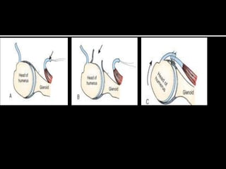The document discusses unstable shoulder dislocations, including types, causes, biomechanics, and management approaches. It details evaluations for recurrent dislocation, associated injuries like Bankart and Hill-Sachs lesions, and outlines treatment options such as closed manipulation, surgical stabilization, and rehabilitation. The document emphasizes the importance of both non-operative and surgical interventions based on the specific instability type and patient response.