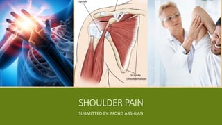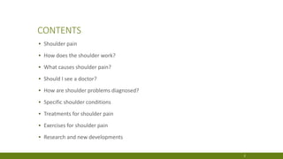 This document provides information about shoulder pain, including common causes and treatments. It describes how the shoulder is made up of ball-and-socket joints that allow a wide range of movement. Shoulder pain can be caused by issues in the muscles, tendons, bursae or joints, sometimes due to injury or conditions like arthritis. Specific shoulder conditions discussed include tendonitis, frozen shoulder, osteoarthritis, and polymyalgia rheumatica. Doctors may diagnose the issue through examination of symptoms and range of motion, and sometimes imaging tests. Treatment depends on the underlying problem but may include rest, exercises, medications, injections, or surgery.