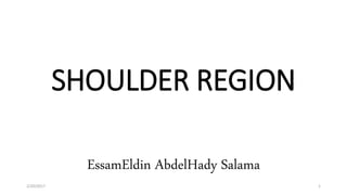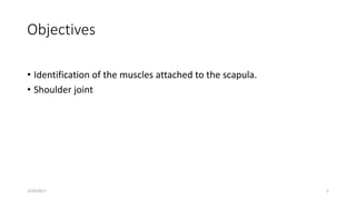 The document discusses the muscles and joints of the shoulder region. It identifies the major muscles that connect the upper extremity to the scapula, thoracic wall, and shoulder joint. These include the trapezius, deltoid, rotator cuff muscles, and others. It then describes the shoulder joint as a ball-and-socket synovial joint between the humerus and scapula. The joint is stabilized by ligaments and muscles but is also inherently unstable. A wide range of motion is possible at the joint, including flexion, extension, abduction, adduction, and rotation. Blood supply to the region is provided by several arterial anastomoses around the scapula.