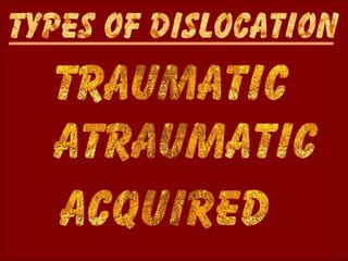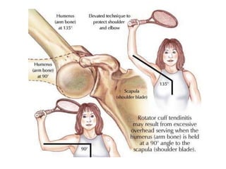 This document discusses various injuries and conditions related to the shoulder. It covers topics like shoulder anatomy, types of separations and fractures, mechanisms of different injuries, grades of injuries, signs and symptoms, treatment approaches, and more. Specific conditions covered include acromioclavicular separations, clavicle fractures, sternoclavicular joint separations, shoulder dislocations, supraspinatus tendonitis, and impingement syndrome. Diagrams are included to illustrate shoulder anatomy and various injuries.