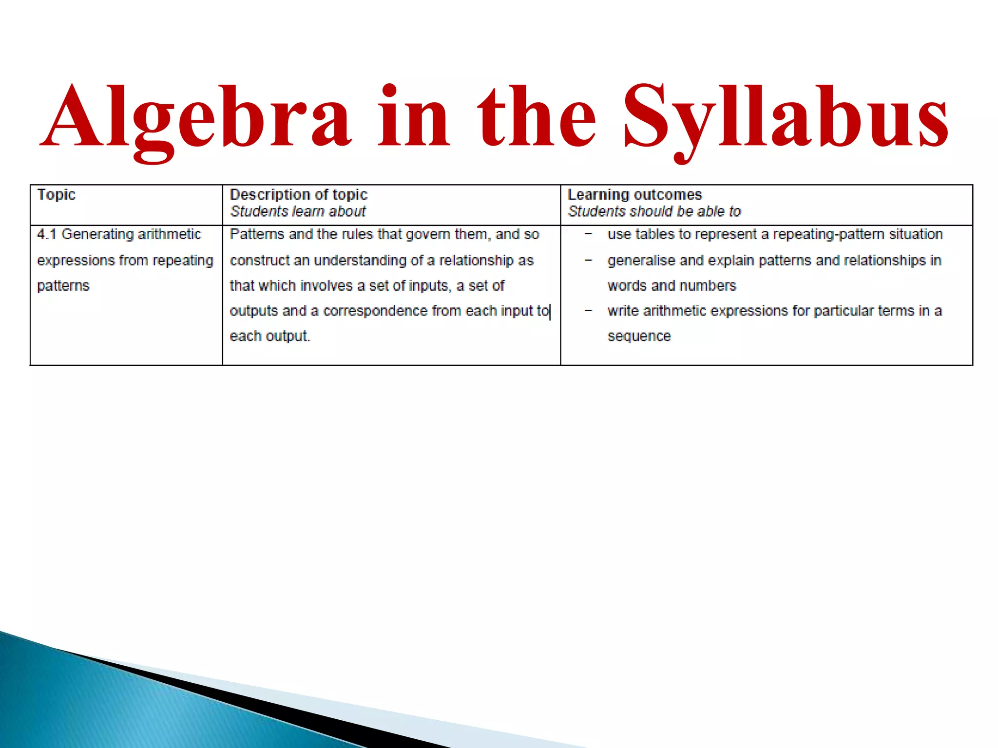 This document outlines an algebra topic in a syllabus, describing that students will learn about an unspecified algebra topic and the intended learning outcomes which are that students should be able to do something related to the topic but is not stated.