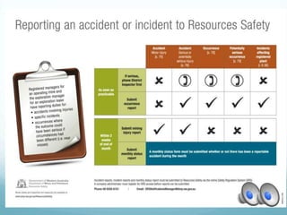 The document discusses claims and injury management. It outlines the responsibilities of different personnel in injury management and the process for injury claims. This includes immediately reporting injuries, obtaining medical certificates, creating return to work plans, notifying insurers, and filing claims. It also discusses relevant legislation and resources for managing workers' compensation claims and injuries in an optimal way through early intervention and rehabilitation.