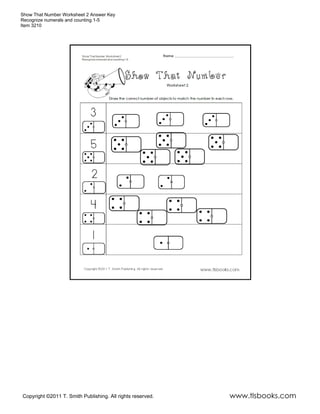 This worksheet teaches number recognition for numbers 1-5 by having students draw the corresponding number of objects for each numeral. It provides practice identifying numerals and counting through interactive drawing. The document includes the worksheet, answers, and copyright information for the publisher.