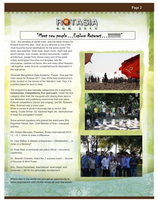 This issue of the Rotaract District 3010 newsletter highlights several club activities from January 2011. Rotasia Goa 2011, the annual international Rotaract event held in Goa, saw participation from 22 Rotaractors from the district. Several clubs organized polio vaccination drives and camps. Other activities included blood donation drives, fundraisers for underprivileged children, tree plantation events, and participation in marches against corruption. The DRR's message emphasizes the importance of communication between clubs and with the district for growth. Club reports provide further details on specific club activities over the month.