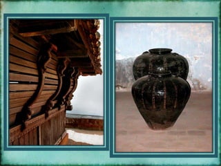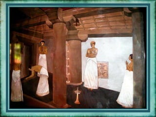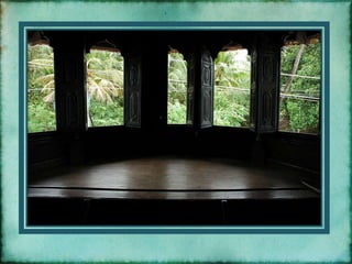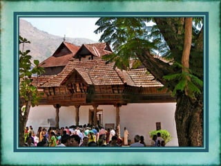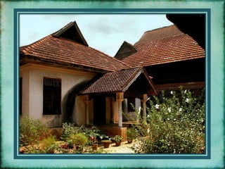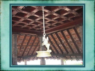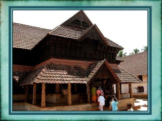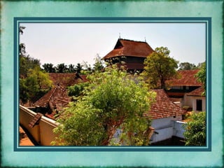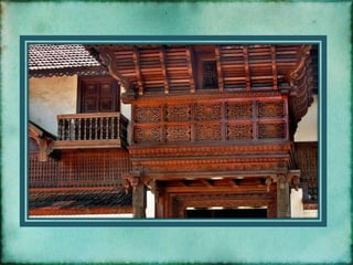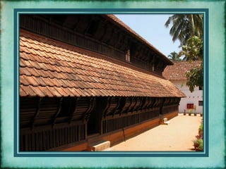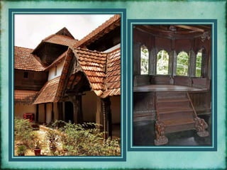 The Padmanabhapuram Palace located in Tamil Nadu was once the home of the royal family of Travancore in Kerala. Built in the 16th century, it is considered one of the best examples of traditional Kerala wooden architecture with carved wooden elements and murals. The palace complex is located within a four kilometer long old granite fortress and includes buildings connected by courtyards and corridors to provide air flow and shade. Though now in a different state, it remains maintained as an important part of Kerala's architectural heritage.