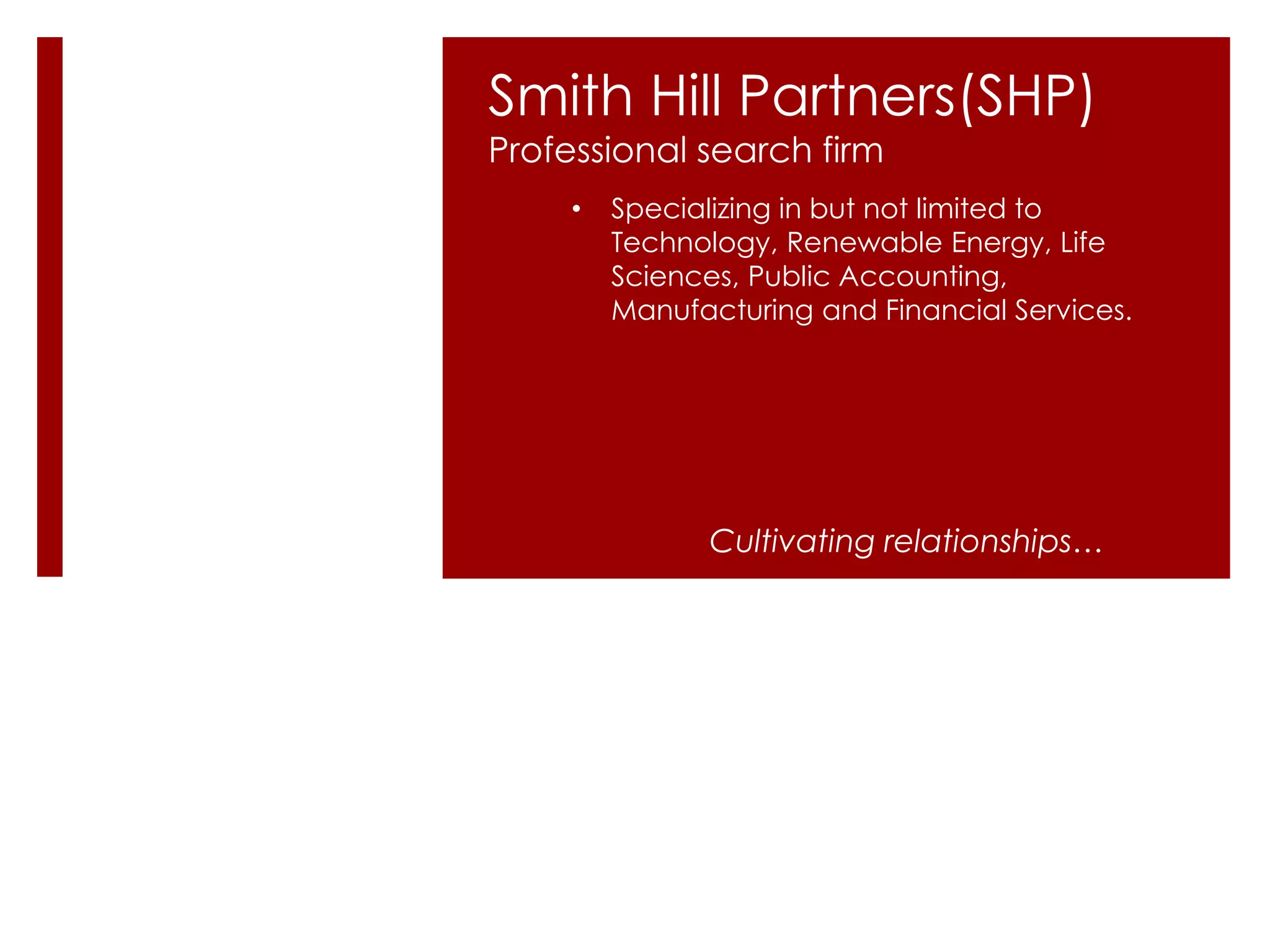 Smith Hill Partners is a professional search firm that specializes in placing candidates in technology, renewable energy, life sciences, public accounting, manufacturing, and financial services positions. They offer cost-effective contingent search solutions with a focus on quality results through their limited client base and vetting process. Their unique nine-step candidate vetting process and industry-leading conversion rates help clients save time and find ideal hires.