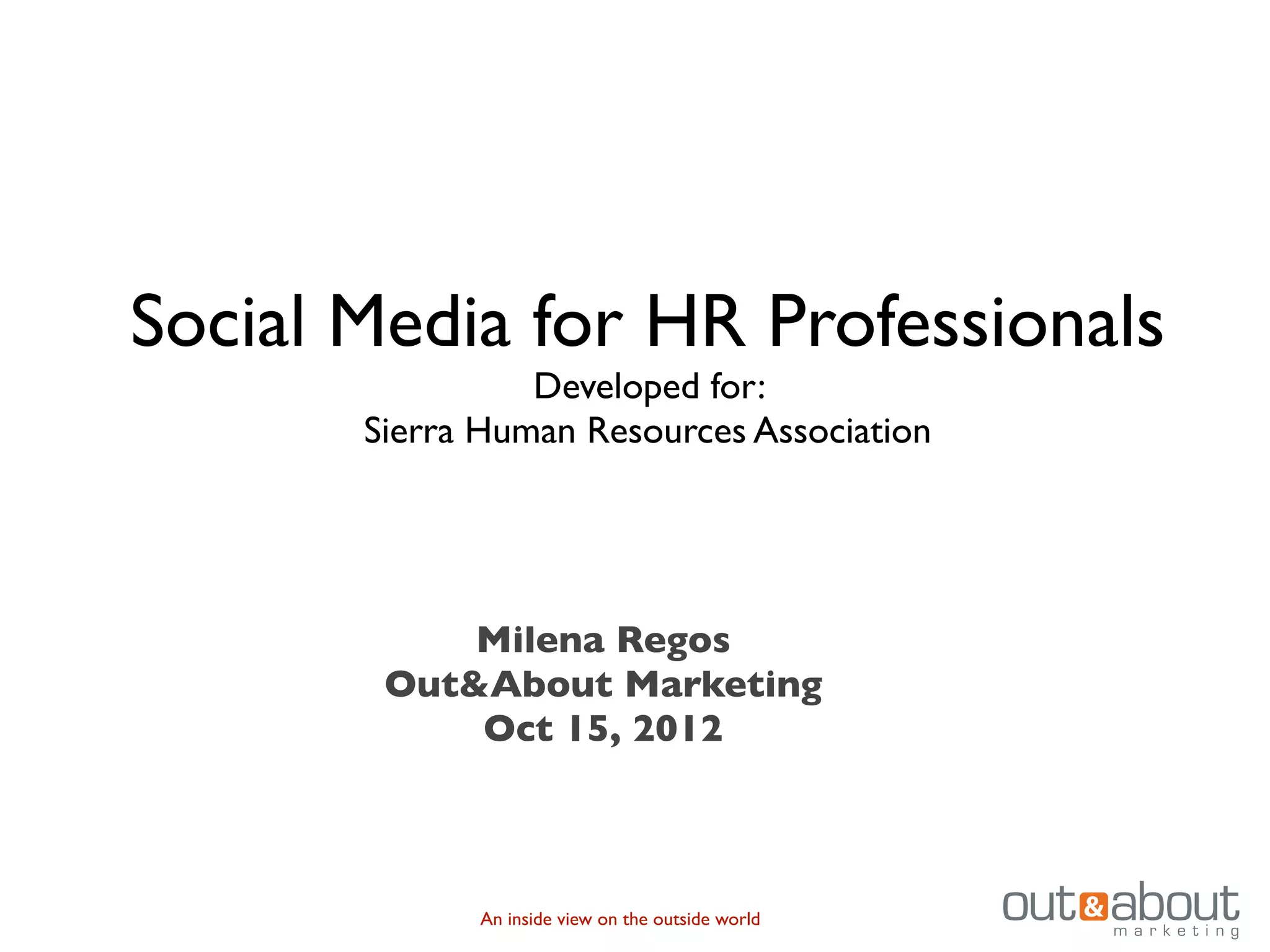 This document summarizes a workshop on social media for HR professionals. The workshop covers developing a social media strategy and policy, recent court rulings regarding social media use by employees, using social media for internal communication and recruitment, and corporate social responsibility on social media. It provides examples of social media strategies and policies from different companies. It also discusses legal issues around monitoring and terminating employees for social media posts.