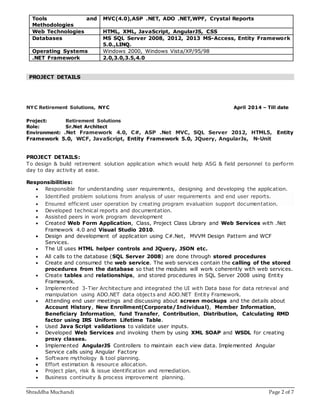 This document provides a summary of Shraddha Muchandi's experience and qualifications. It outlines over 10 years of experience in .NET application development, support, and unit testing. It also details experience with technologies like C#, ASP.NET, AngularJS, JavaScript, HTML, and SQL Server. Recent projects are described along with responsibilities like requirements gathering, design, development, testing, and project management. Educational background and technical skills are also included.