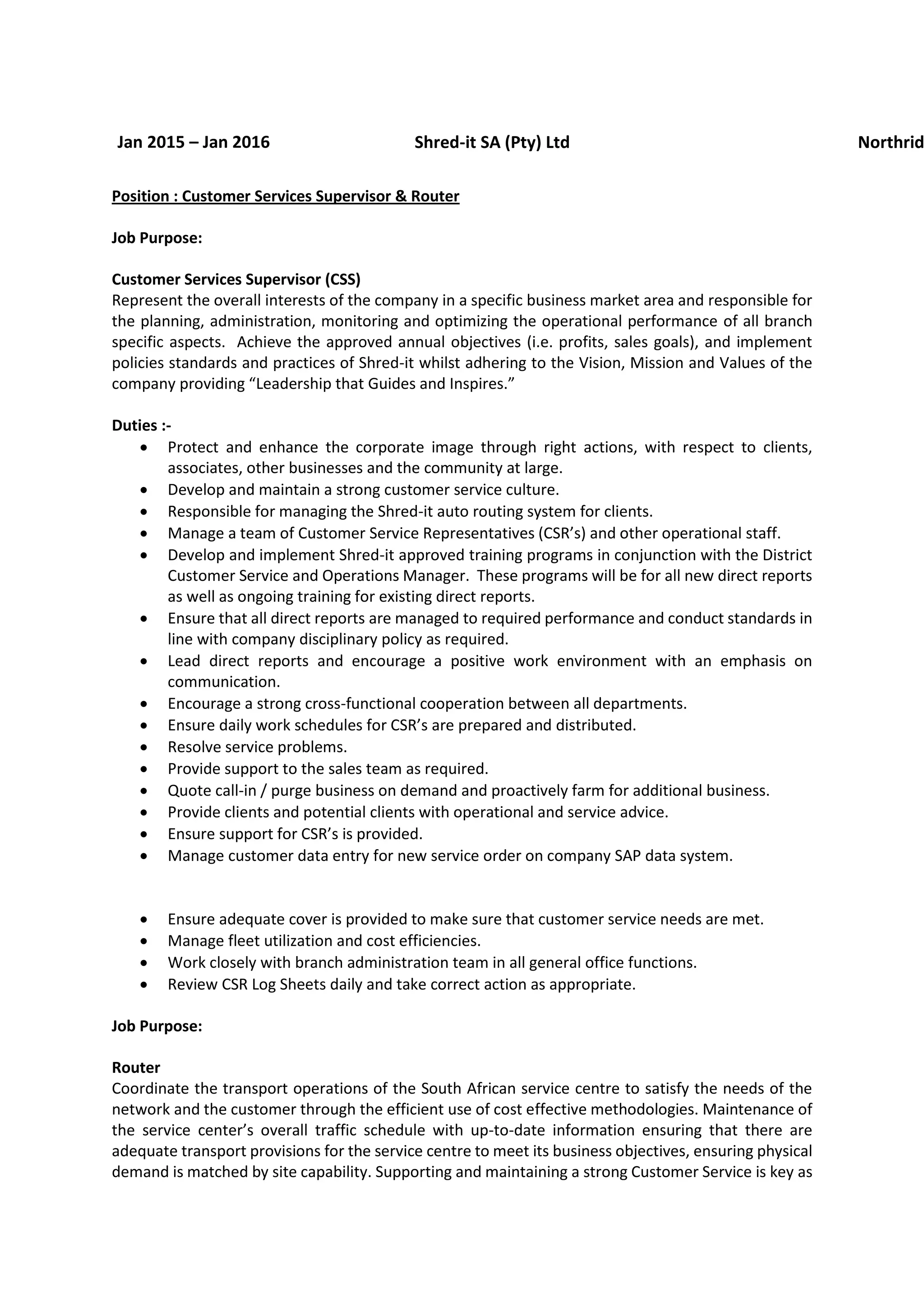 The document summarizes a job held by the author from January 2015 to January 2016 as a Customer Services Supervisor and Router at Shred-it SA in Northrid. As Customer Services Supervisor, the author's responsibilities included protecting Shred-it's corporate image, developing a strong customer service culture, managing a team of customer service representatives, and ensuring performance standards were met. As Router, the author's duties were to prepare daily work schedules, plan efficient transport routes using the routing system, resolve service issues, and maintain high levels of customer service communication. The contract for this position expired in January 2016.