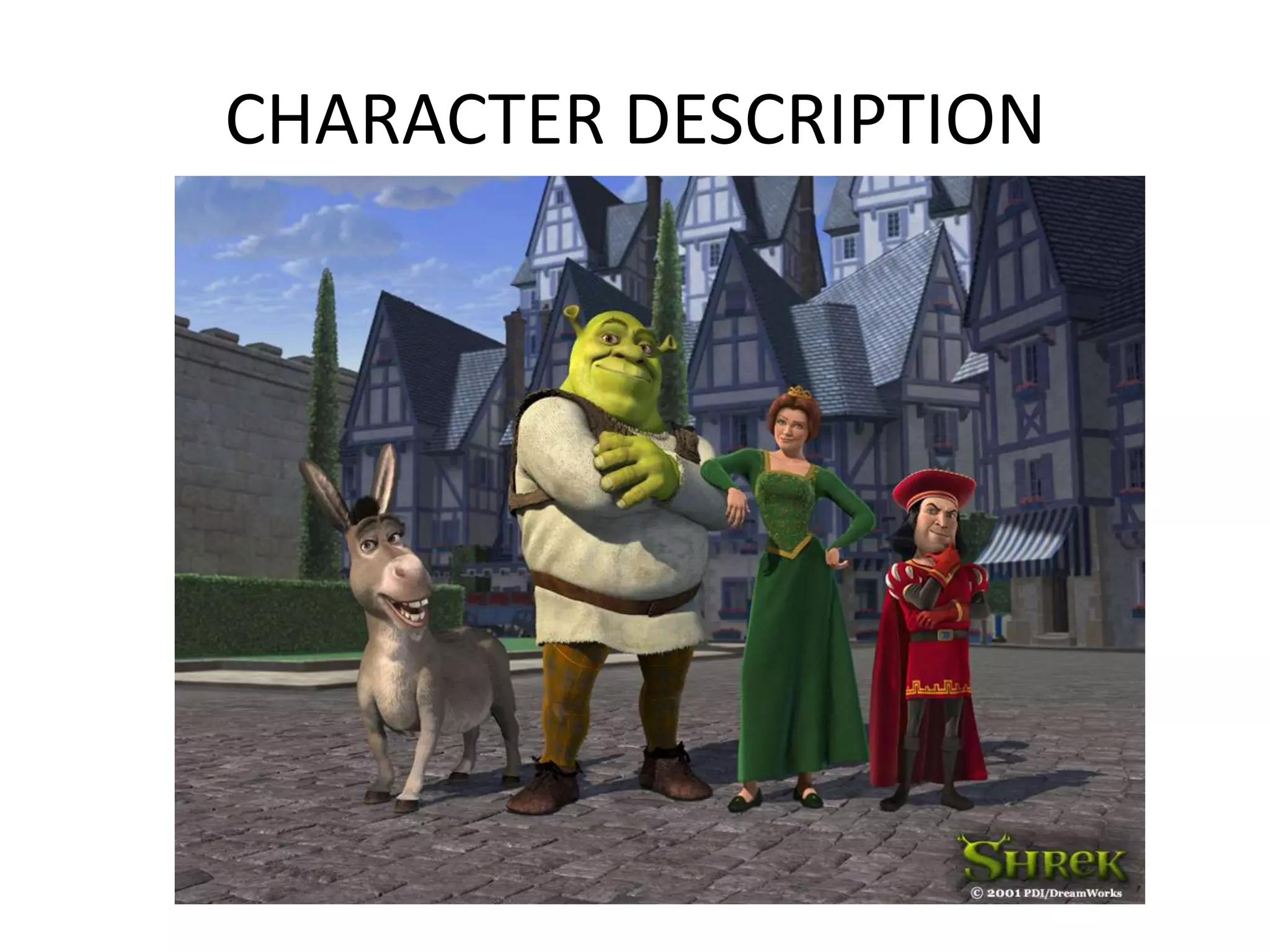 This character description summarizes an ogre who is about 30 years old, 193cm tall with a large, green body and round face. He has a peaceful but cranky personality and prefers living alone in his swamp. His skills include scaring villagers but he struggles to make friends, though he finds companionship with Donkey and later falls in love with and marries Princess Fiona.