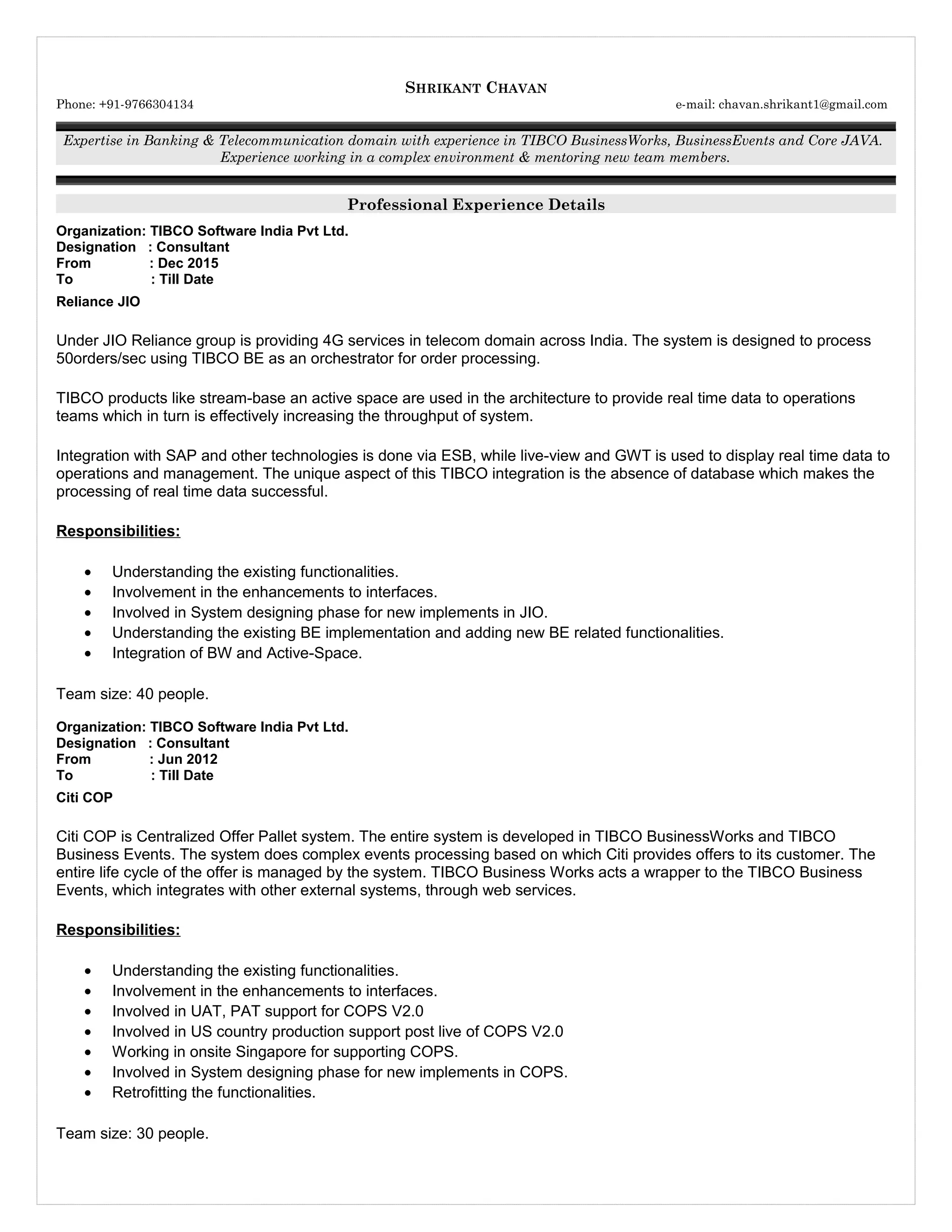 This document contains the resume of Shrikant Chavan summarizing his work experience and qualifications. He has over 7 years of experience working with TIBCO technologies like BusinessWorks, BusinessEvents and ActiveSpaces. His experience includes working on projects in the banking and telecommunications domains for companies like Reliance JIO, Citi, and Oracle Financial Services. He has expertise in system design, development, testing and support of order processing, offers management and alerts generation systems.