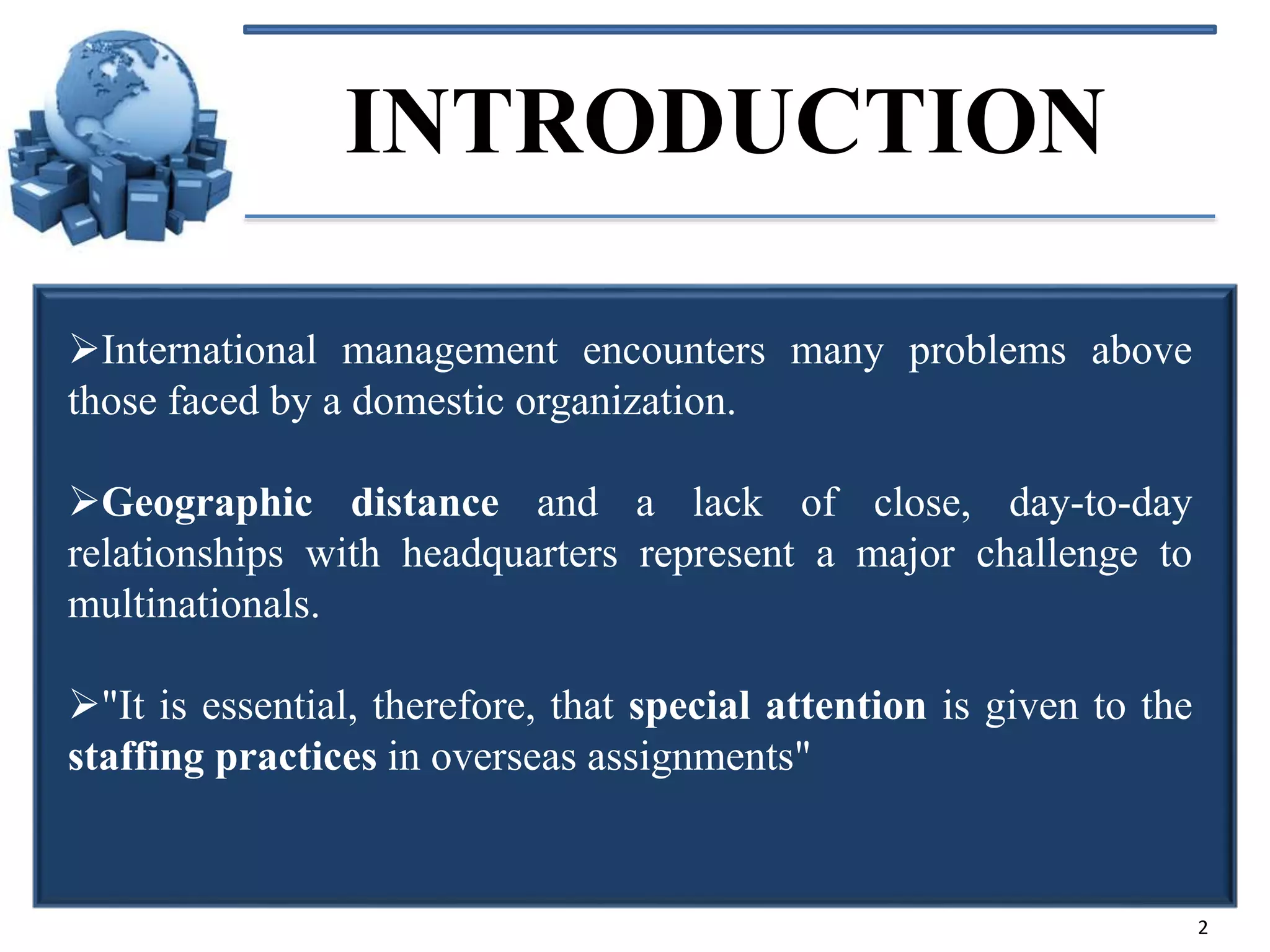 This document discusses recruitment and selection of human resources for global assignments. It addresses the challenges of staffing a global business and outlines different types of international assignments. Key points discussed include considering parent country nationals, host country nationals, or third country nationals for positions. Factors like costs, cultural proximity, and promotion opportunities should be evaluated. The document also examines recruitment sources, methods, and necessary skills for international managers. Selection criteria focuses on technical, interpersonal, and cultural competencies to improve expatriate success rates.