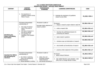 This document outlines the curriculum for a Practical Research 1 subject for senior high school students in the applied track. The course develops critical thinking and problem-solving skills through qualitative research. It covers topics such as the nature of inquiry and research, qualitative research and its importance, identifying an inquiry and stating a research problem, reviewing related literature, understanding and collecting data, analyzing data and drawing conclusions, and reporting findings. The goal is for students to gain experience with the full research process and apply it to topics relevant to their daily lives.