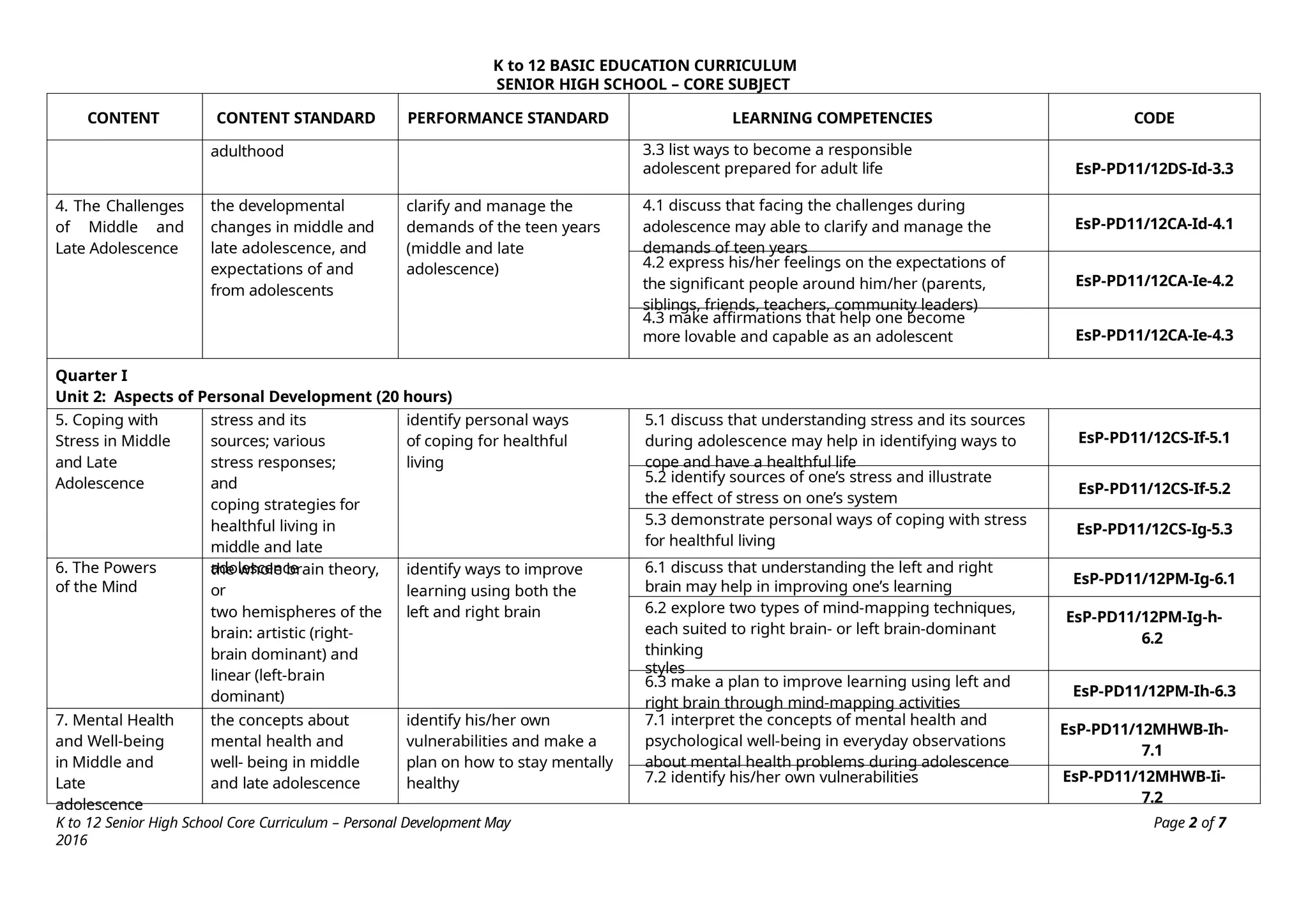 The K to 12 Basic Education Curriculum for senior high school includes a core subject titled Personal Development that aims to help students understand themselves during their developmental stage while preparing for career decisions. It consists of modules covering self-development, coping with stress, mental health, building relationships, and career development, all employing an experiential learning approach. The course emphasizes personal reflections and practical applications to foster holistic growth and readiness for adulthood.