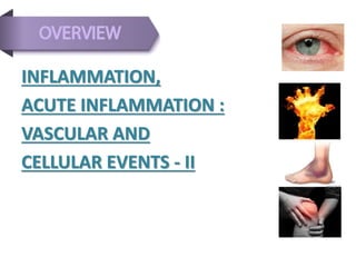 This document discusses chronic inflammation. It defines chronic inflammation as prolonged inflammation lasting weeks or months, where continuing inflammation, tissue destruction, and healing occur simultaneously. Key features of chronic inflammation include infiltration of mononuclear cells like macrophages, T-lymphocytes, and plasma cells, as well as tissue destruction caused by a persistent offending agent or inflammatory cells, and attempts at healing through connective tissue replacement. Granulomas, a hallmark of chronic inflammation, are also described.