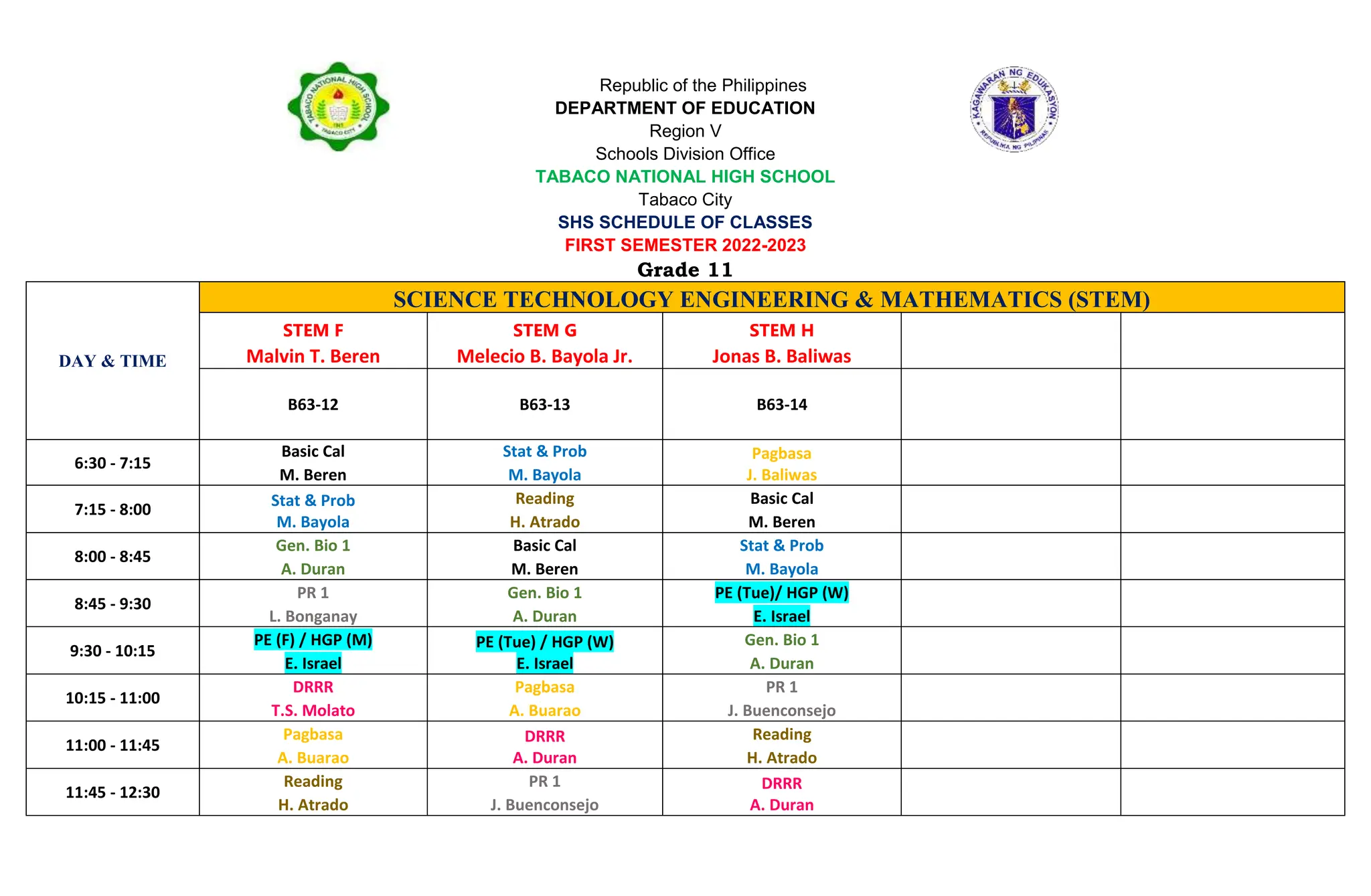 This document provides the schedule of classes for the second semester of the 2023-2024 school year at Tabaco National High School. It lists the subjects, teachers, rooms, and time periods for different strands including STEM, ABM, HUMSS, GAS and TVL. The schedule is broken down by grade, strand, section, subject, teacher, and time period from 6:30am to 12:30pm from Monday to Friday.