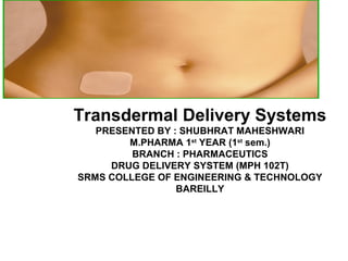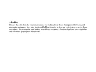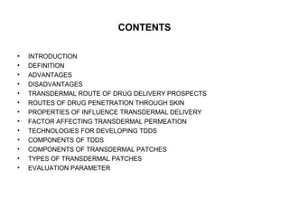 This document discusses transdermal drug delivery systems. It defines transdermal delivery as delivering drugs through the skin into systemic circulation at predetermined rates over prolonged periods. The key advantages are avoiding gastrointestinal degradation and first-pass metabolism, providing controlled drug levels, and increasing patient compliance. The document covers skin anatomy, permeation pathways, factors influencing permeation like drug properties, and technologies used to develop transdermal patches.