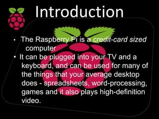 The Raspberry Pi is a credit-card sized computer that can perform many desktop tasks like spreadsheets and word processing. It was created by the Raspberry Pi Foundation to improve computer science education. For only $25-35, it provides an affordable way for students to learn programming through a full computer with HD video output, USB ports, and Linux OS support. The Raspberry Pi uses a Broadcom system-on-chip and runs software like Python to make computing concepts accessible. It has found applications in areas like robotics, home automation, and digital signage.