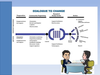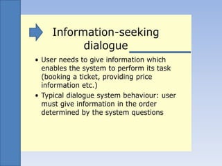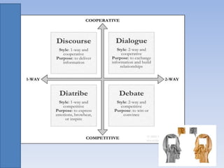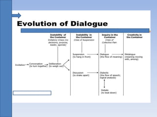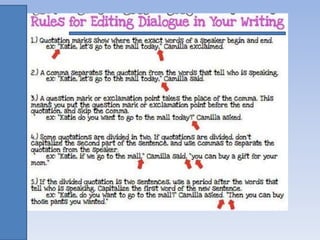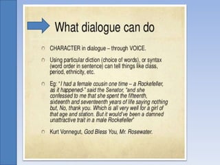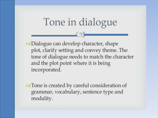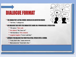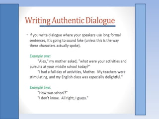 This document discusses dialogue writing and provides examples. It defines dialogue as a verbal exchange between two or more people, noting that dialogue allows readers to know characters firsthand rather than just explaining them. It provides examples of different types of dialogue, including interruption, answering anticipated questions, and using exclamations. The document also discusses the functions and importance of dialogue, as well as punctuation and mapping techniques for dialogue.