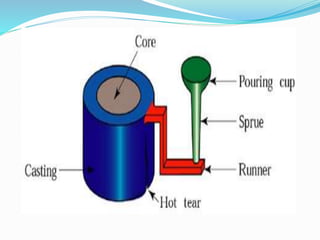 This document discusses various common defects that can occur in sand castings, their causes, and how to minimize them. It describes defects such as misruns and cold shuts caused by improper filling before solidification. Shrinkage faults result from inadequate feeding due to poor gating/risering design or solidification issues. Rat tails and buckles are caused by compressed sand layers from heat expansion. Core shifts are from improper core support. Remedies involve design improvements and controlling variables like pouring temperature and solidification.