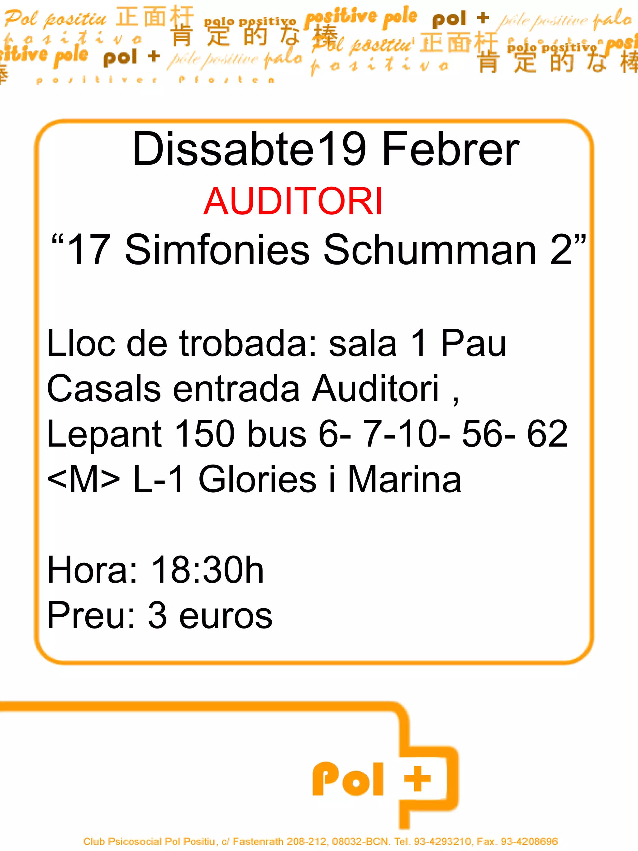 Dissabte19 Febrer AUDITORI “ 17 Simfonies Schumman 2” Lloc de trobada: sala 1 Pau Casals entrada Auditori , Lepant 150 bus 6- 7-10- 56- 62 <M> L-1 Glories i Marina Hora: 18:30h Preu: 3 euros - 2.