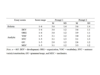 The document summarizes earlier studies that examined relationships between writing and speaking skills for EFL learners. It presented findings from two previous studies that analyzed TOEFL writing and speaking samples. Both studies found high correlations between holistic and analytic scoring rubrics, and among scores from each rubric. The present study aims to explore relationships between writing and speaking as productive skills, using the same participants and scoring rubrics as the earlier studies.