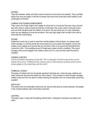 The document provides an analysis of editing, camera shots, sound, themes, symbolic codes, ideology, lighting, narrative, characters, representation, setting, and mood/tone in the film. It discusses how the film uses flashbacks to reveal the past, high and low camera angles to show control, subjective sound to portray mental problems, the theme of isolation, symbolic clothing to represent characters, the portrayal of an uncontrolled world held back by social restraints, dark and contrasting lighting, serious protagonists and uplifting side characters, changing representation of the main character, an isolated setting shown through contrasting colors, and a growing ambiguous mood leading to a dark ending.