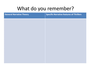 The document discusses how the film Shutter Island uses and develops narrative theory, specifically looking at how it employs elements of thriller narratives such as plot twists, flashbacks, mysterious characters, and deadlines to keep the audience guessing. Students are asked to analyze the opening sequence of the film in groups, identifying how it sets up narrative elements and establishes settings, characters, and potential conflicts through the lens of general narrative theory and thriller conventions. They are also given an extension task to annotate screen grabs from the film analyzing camerawork and mise-en-scene techniques.
