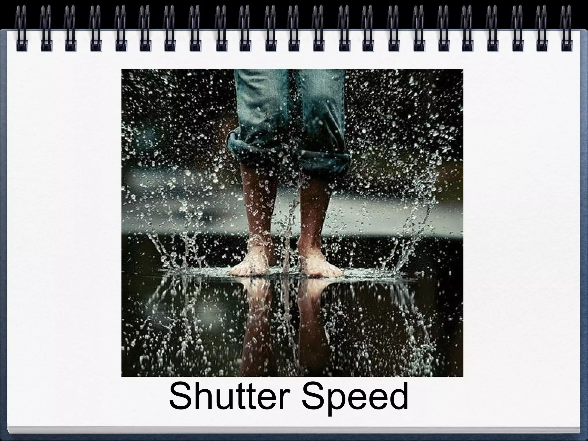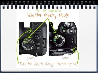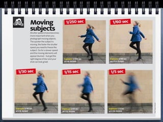 The document discusses shutter speed, which is the amount of time the camera shutter remains open, allowing light to pass through to the image sensor. Shutter speed is measured in fractions of a second and determines how movement is rendered - faster shutter speeds "freeze" motion while slower shutter speeds blur motion. The appropriate shutter speed depends on the desired effect and how fast the subject is moving. Very fast shutter speeds are often used for sports photography, while slower shutter speeds can be used to blur water or for night photography if using a tripod to avoid camera shake. The document provides examples of shutter speeds and their effects and suggests assignments involving practicing with different shutter speeds.