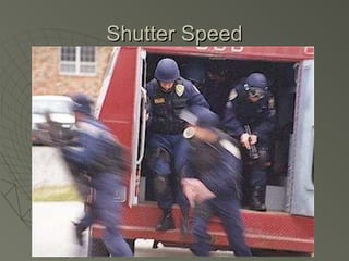 This document repeatedly discusses shutter speed, which is a key setting in photography that determines the duration that the shutter is open to allow light to enter the camera body and expose the image sensor or photographic film. The shutter speed setting controls the amount of light and action or motion that will be recorded in the captured photo.