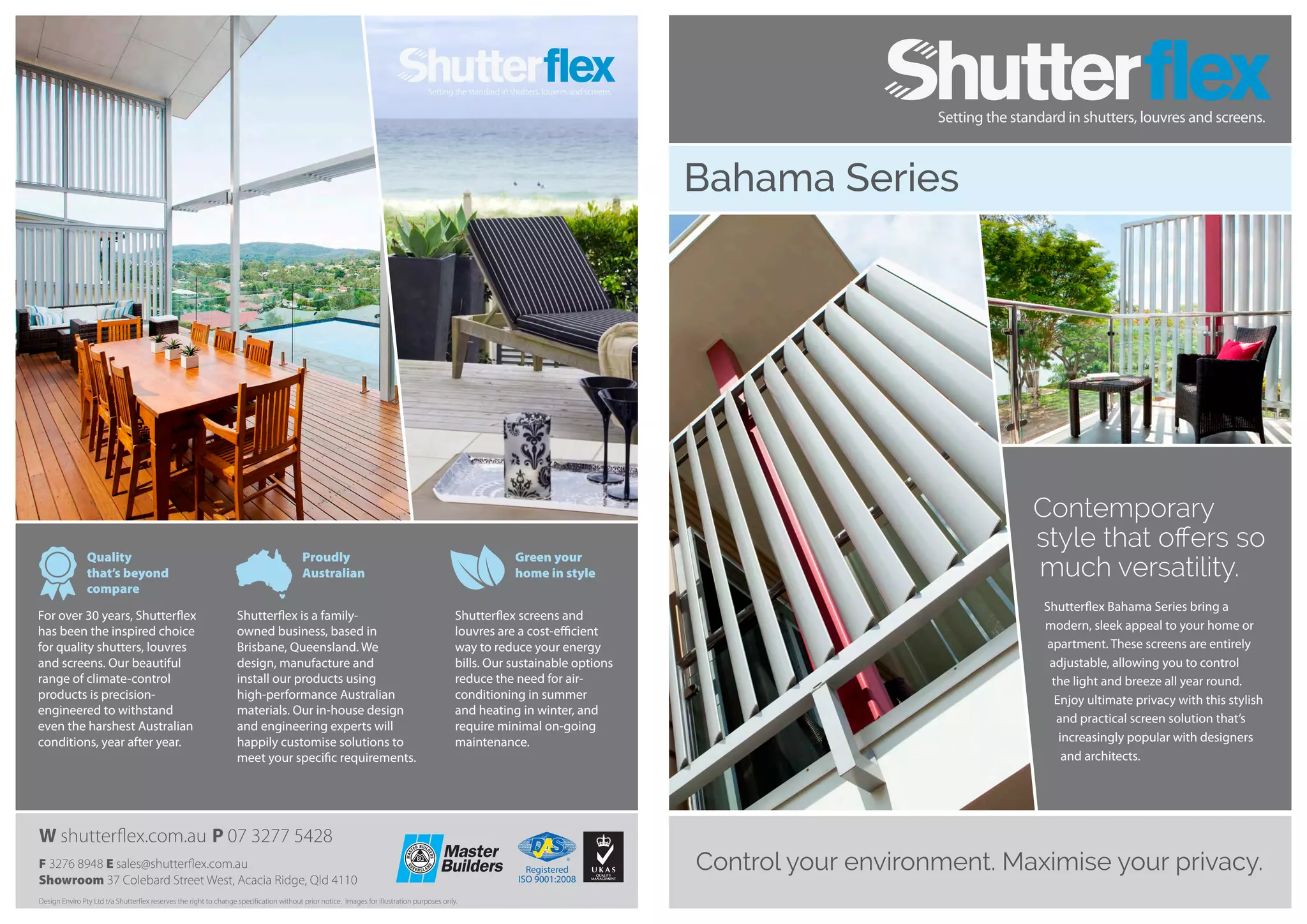 This document summarizes an advertisement for Shutterflex, an Australian manufacturer of shutters, louvres, and screens. It describes Shutterflex as a family-owned business that has been operating for over 30 years. It precision-engineers climate control products to withstand harsh Australian conditions using high-performance Australian materials. Shutterflex's sustainable products like screens and louvres can reduce energy bills by decreasing needs for air conditioning and heating while requiring minimal maintenance. The document provides examples of Shutterflex's product lines and customization options.