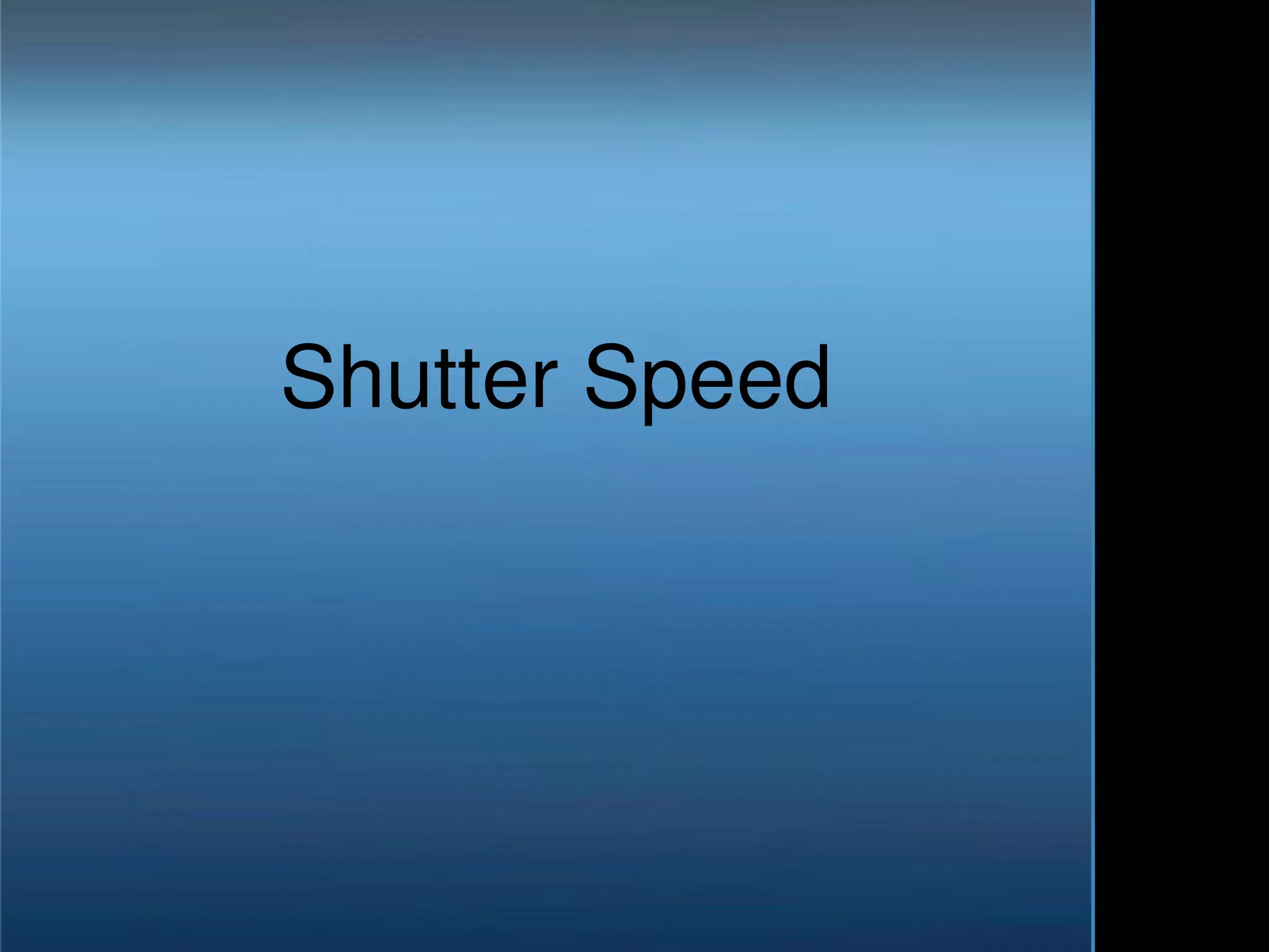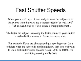 Shutter speed controls the duration that the camera shutter is open, allowing light to enter and expose the image sensor. The longer the shutter is open, the more light is captured but movement becomes blurred, while very fast shutter speeds freeze motion but require more light. Shutter speed is measured in fractions of a second and is adjusted to either freeze or convey motion, depending on the photographic intent. Fast shutter speeds are used to freeze action while slow shutter speeds blur movement. Camera shake is also more likely at slower shutter speeds without a tripod.