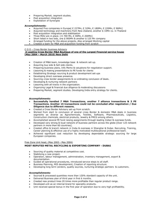 This document provides a summary of Shyam Sundar Jhanwar's professional experience and qualifications for a top management position in investment banking, mergers and acquisitions, private equity, or business development. It outlines over 16 years of experience in M&A advisory, business development, and strategic sourcing. Recent roles include leading the M&A team of a $7.5B heavy engineering group and serving as COO of a leading cross-border M&A boutique. Core competencies include deal structuring, valuation, marketing, relationship building, and team leadership.