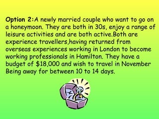 This document provides cruise and travel options for a couple's honeymoon with a $18,000 budget. It describes several destinations in the South Pacific that could be visited on a 10-14 day cruise, including Norfolk Island for hiking in national parks, Suva, Fiji known for its colonial architecture, Port Denarau Marina near Nadi, and Port Vila, the capital of Vanuatu known for its beaches and culture. It also lists excursions and estimates the total cost of a cruise visiting these locations would be $18,000 or less, suitable for the couple's budget.