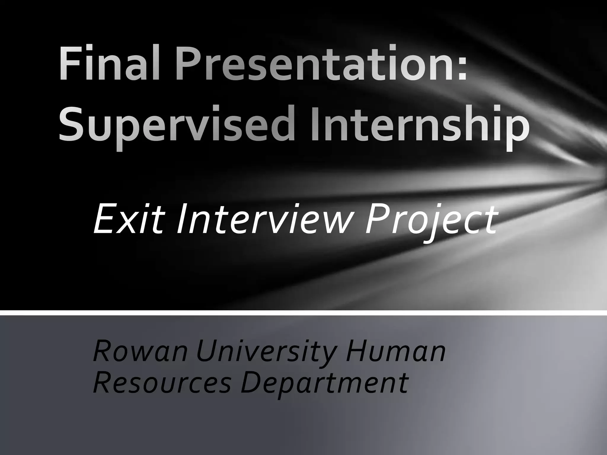 This document summarizes an exit interview project for Rowan University. The objectives are to summarize and confirm exit interviews of terminated or retired employees. Deliverables include statistics on interviews and an Excel spreadsheet of interviewed employees. Tasks include inputting data from surveys into SurveyMonkey, analyzing results, and confirming return of university property with supervisors. Survey results show that most employees leaving were satisfied with their supervisors, positions, working conditions, and compensation. However, advancement opportunities were less satisfactory. Recommendations include increasing advancement and improving the exit survey process.