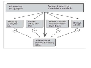 This document summarizes pathologies of the sacroiliac (SI) joint that can be identified on MRI. It describes the anatomy of the SI joint and classifies diseases as spondyloarthropathies. Signs of active inflammation on MRI include bone marrow edema, synovitis, capsulitis, and enthesitis. Chronic changes include subchondral sclerosis, erosions, and ankylosis. Differential diagnoses discussed are infective sacroiliitis, osteoarthritis, stress reactions, insufficiency fractures, and osteitis condensans ilii. Images are provided to illustrate the radiological findings of various SI joint pathologies.