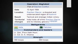 The document discusses the Siachen Glacier conflict between India and Pakistan. It provides background on the geography and history of the conflict-ridden region. Specifically, it details how India gained control of the glacier in 1984 through Operation Meghdoot amid competing territorial claims by both countries. While India controls most of the glacier, the situation remains militarized with casualties occurring frequently over the past decades. Potential solutions discussed include demilitarization and establishing a joint or international peacekeeping administration of the strategically important but inhospitable terrain.