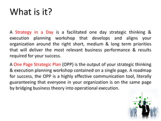 The document describes a facilitated one-day workshop called 'strategy in a day' that helps organizations align on short, medium, and long-term priorities for improved business performance. It introduces the 'one-page strategic plan' (OPP) as a concise roadmap that establishes clarity, alignment, and accountability within teams, ensuring that everyone contributes effectively to organizational success. The process is designed to foster strategic dialogue, define key results, and create a structured approach to achieving desired outcomes in a dynamic business environment.
