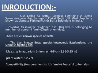 1. Betta splendens, also known as Siamese fighting fish, are colorful freshwater fish native to Southeast Asia.