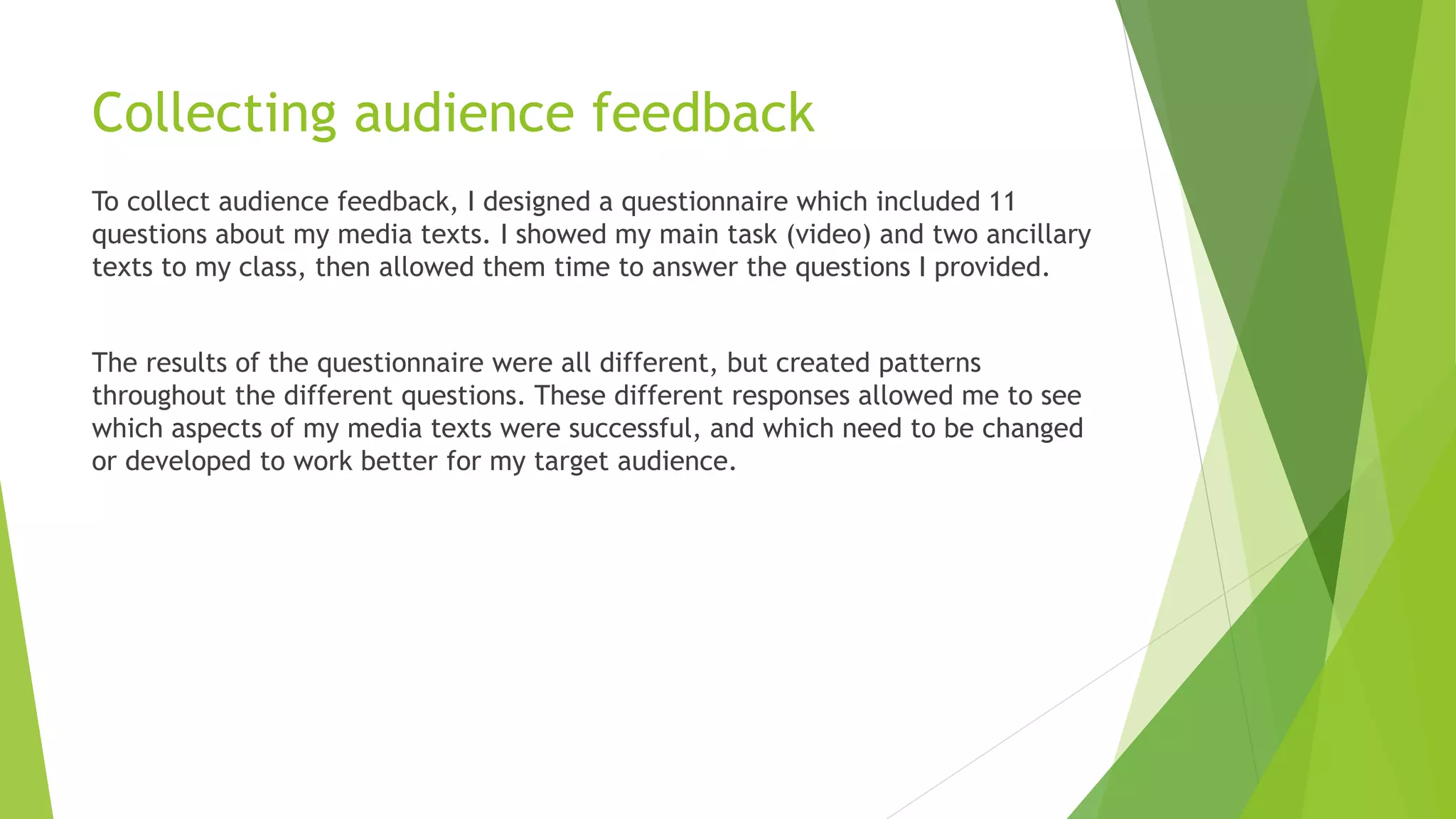 The document summarizes feedback received from an audience questionnaire about the creator's media texts, including a video and two ancillary texts. Key findings include: