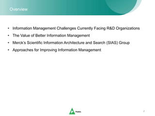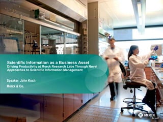 John Koch of Merck presented on improving scientific information management at Merck Research Labs. He discussed the challenges of managing vast amounts of scientific data and information from multiple sources. Merck's Scientific Information Architecture and Search group developed an approach to engage business areas, identify pain points, pilot solutions, and embed improved practices. Their solution called QUICK created a centralized knowledgebase of pre-clinical compound data to address issues like dispersed data, duplicative data capture, and inaccessible definitive data. It is expected to improve data reporting efficiency, analytical productivity, and collaboration while enabling better study selection decisions.