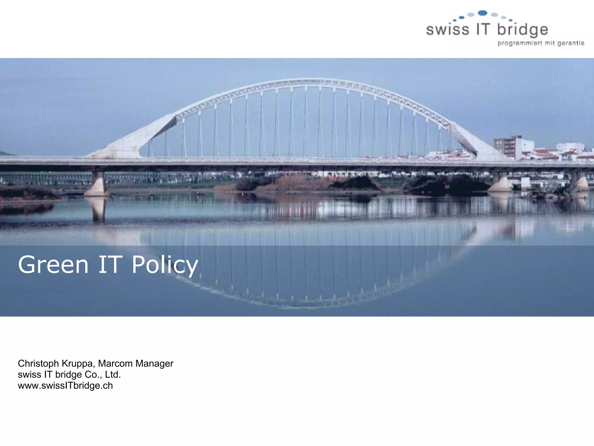 The document discusses the Green IT Policy of swiss IT bridge Co., Ltd. It notes that as Vietnam industrializes, pollution increases which harms the environment. The company aims to reduce its environmental impact through measures like using energy efficient devices, reducing unnecessary energy use, and offsetting remaining emissions through carbon offset projects. The policy is continuously evaluated and improved to support Vietnam's growth in a sustainable manner.