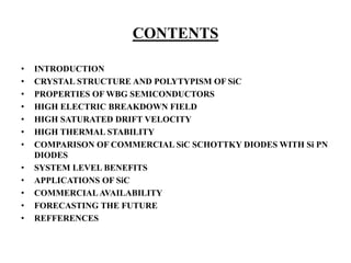 The document provides an overview of wide bandgap semiconductors like silicon carbide for replacing silicon in power electronics applications. It discusses the crystal structure and properties of silicon carbide that give it advantages over silicon like higher breakdown voltage and thermal stability. These allow silicon carbide devices to operate at higher voltages, temperatures, and frequencies. The document compares the performance of commercial silicon carbide Schottky diodes to silicon PN diodes, showing the silicon carbide diodes have lower conduction and switching losses. Adopting silicon carbide power electronics can provide benefits like increased efficiency and reduced system size and cooling requirements.