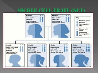 Sickle cell anemia is a genetic blood disorder caused by a mutation in the beta-globin gene. This mutation causes red blood cells to become rigid and sickle-shaped, which can block blood vessels and cause pain. It results in low oxygen transport and anemia. Symptoms vary but can include fatigue, pain crises, infections, and organ damage. Treatment focuses on prevention of complications, pain management, antibiotics, hydration, folic acid supplements, and transfusions in severe cases. While there is no cure, management has improved life expectancy significantly in recent decades.