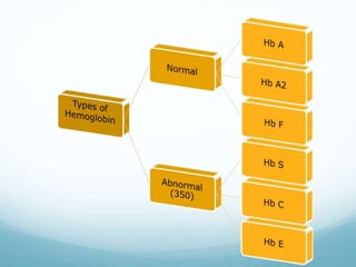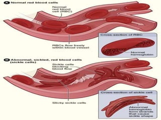 This document provides an overview of sickle cell anemia, including its definition, genetics, history, symptoms, complications, diagnosis, and treatment. Specifically, it describes how sickle cell anemia is an inherited form of anemia where red blood cells become rigid and crescent shaped, which can block blood flow. It discusses the genetic basis and inheritance patterns. Symptoms include anemia, pain crises, infections, and organ damage. Treatments aim to prevent crises and complications through medications, blood transfusions, and potentially a bone marrow transplant to cure the disease.