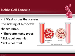 Sickle cell disease is an autosomal recessive disorder caused by mutations in the hemoglobin beta gene, leading to the sickling of red blood cells, with major types including sickle cell anemia and sickle cell trait. Key symptoms arise from complications such as vaso-occlusive crises and infections, and the condition is diagnosed through tests like hemoglobin electrophoresis and DNA analysis. Current treatments focus on managing symptoms, promoting fetal hemoglobin production, and preventing complications, with genetic counseling recommended for affected families.