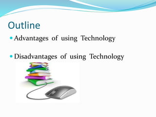 Technology provides several advantages such as helping students with flexible schedules to work remotely, reaching larger audiences across geographic locations, and aiding communication with family abroad. However, technology also presents disadvantages like students spending more time playing games instead of doing homework, health issues from excessive screen time like radiation, and some students not being able to afford modern technologies. Difficulties can also arise from a lack of self-discipline, cyberbullying, and the potential for cheating.