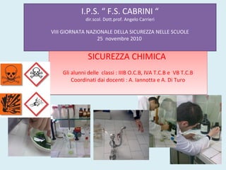 Il documento tratta della sicurezza chimica in laboratorio scolastico, evidenziando le precauzioni necessarie per evitare incidenti e infortuni durante le esperienze pratiche. Vengono elencate norme di comportamento e procedure di sicurezza da seguire, come indossare dispositivi di protezione e gestire correttamente i materiali chimici. Inoltre, si fa riferimento al nuovo regolamento europeo per la classificazione e l'etichettatura dei prodotti chimici, introducendo i cambiamenti nella terminologia e nella simbologia di pericolo.