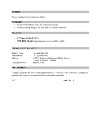Anuj Bali is seeking a position in electronics and communication to utilize his skills and experience. He has a B.Tech in Electronics and Communication from Kurukshetra University. He is proficient in Microsoft Office applications and has undertaken projects on networking and street lights. His competencies include excellent time management, adaptability, and teamwork. His hobbies are playing cricket, internet surfing, and travelling.